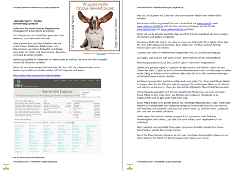 „Andreas Romani, Berater im Verband FCSI, empfiehlt, wenigstens die wichtigsten Bewertungsportale zu beobachten. Das sind Holidaycheck, Tripadvisor, Trivao, QYPE, Yelp und Zoover.